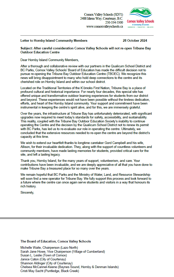 Update Regarding the Tribune Bay Outdoor Education Centre